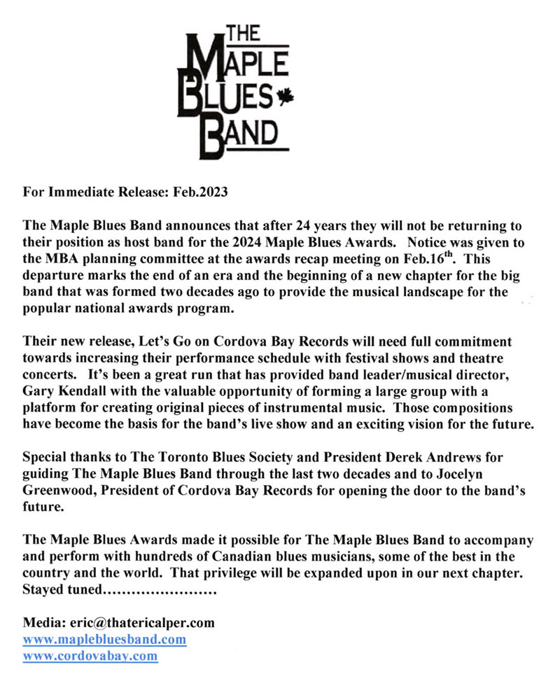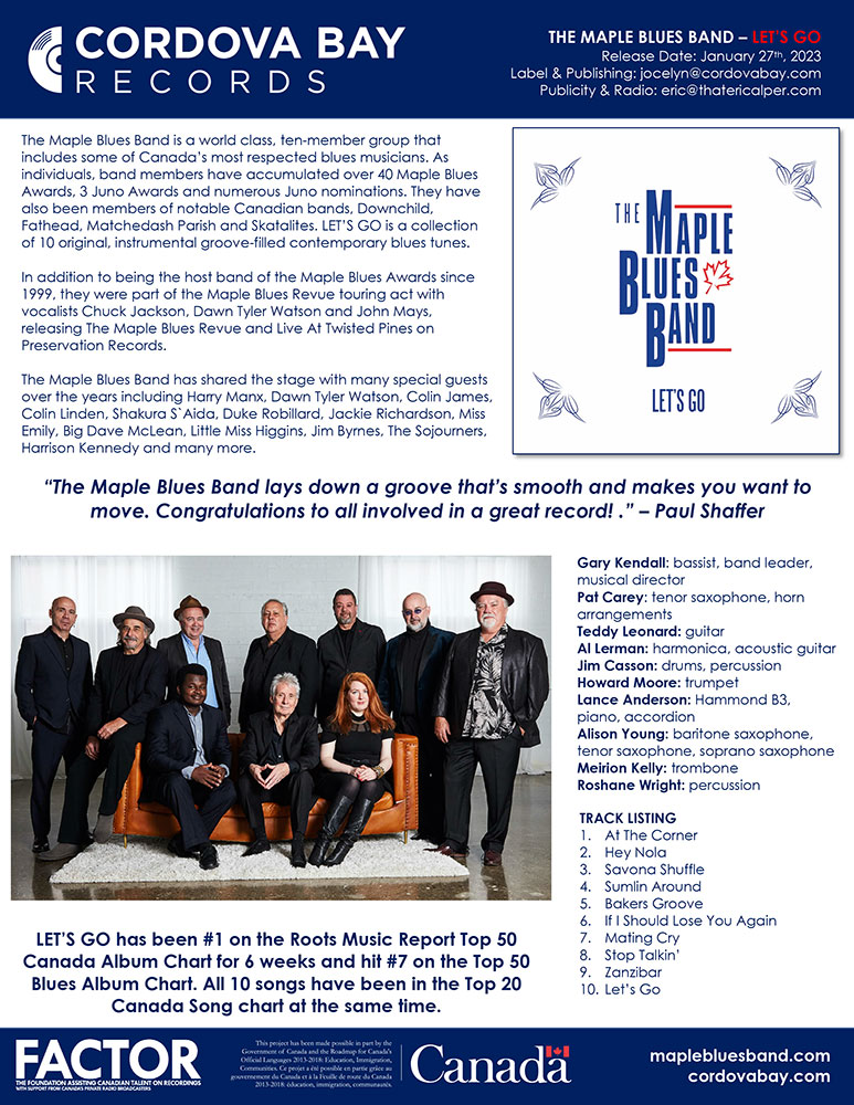 THE MAPLE BLUES BAND BIO Summer 2022, The Maple Blues Band enters Loud Mouse Studios in the Etobicoke neighborhood of Toronto to open a new chapter of their 24 year collaboration. The goal, record ten of the instrumental compositions they’ve compiled during their association with The Maple Blues Awards. The release of a full length album of instrumental music is part of a master plan that will launch the group into the performance market of festivals and concerts. It all began at a Toronto Blues Society programming recap meeting following the 1998 Maple Blues Awards. I boldly told all present that the music that accompanied the award presentations should be better. The come back was “Let’s see what you can do”. It must be working because the band has been the centre piece of the Maple Blues Awards ever since. Twenty-four years ago the ball was in my hands and I knew I had to make it good, really good. I wanted a big band that could play all the blues styles, Delta Blues, Southside Chicago Blues, New Orleans Funk, Uptown Blues, Zydeco, Blues Rock and most of all Canadian Blues. Over the years the musicians that have contributed to making this dream possible all rose to the occasion lending their talent and support. Early in the MBA residency I recognized an opportunity for the composition of original instrumental music as one of the perks that fell in line with the admiral position of accompanying the best singers and musicians performing in the Canadian Blues community. The songwriting helped The Maple Blues Band create a personal and unique sound. It’s what I refer to as Big Band Blues. Every province in Canada has a wealth of well known, well schooled and dedicated blues musicians, the best in the world. The men and women I chose to surround myself with in The Maple Blues Band are part of the enormous southern Ontario pool of blues talent. Each one of them is a star and when I’m in their presence they take me to a very comfortable and extremely high level of musicianship. The twelve tracks on our Cordova Bay Records release, Let’s Go are a group effort. The song writing credits are spread over 24 years and include past and present band members. As part of the Cordova Bay Records family we look forward to taking our music to the world. Gary Kendall The Maple Blues Band: Gary Kendall - bassist, band leader, musical director, Pat Carey - tenor saxophone, horn arrangements, Teddy Leonard - guitar, Al Lerman - harmonica, acoustic guitar, Jim Casson - drums, percussion, Howard Moore - trumpet, Lance Anderson - Hammond B3, piano, accordion,. Alison Young - baritone saxophone, tenor saxophone, soprano saxophone, Meirion Kelly - trombone, Roshane Wright - percussion